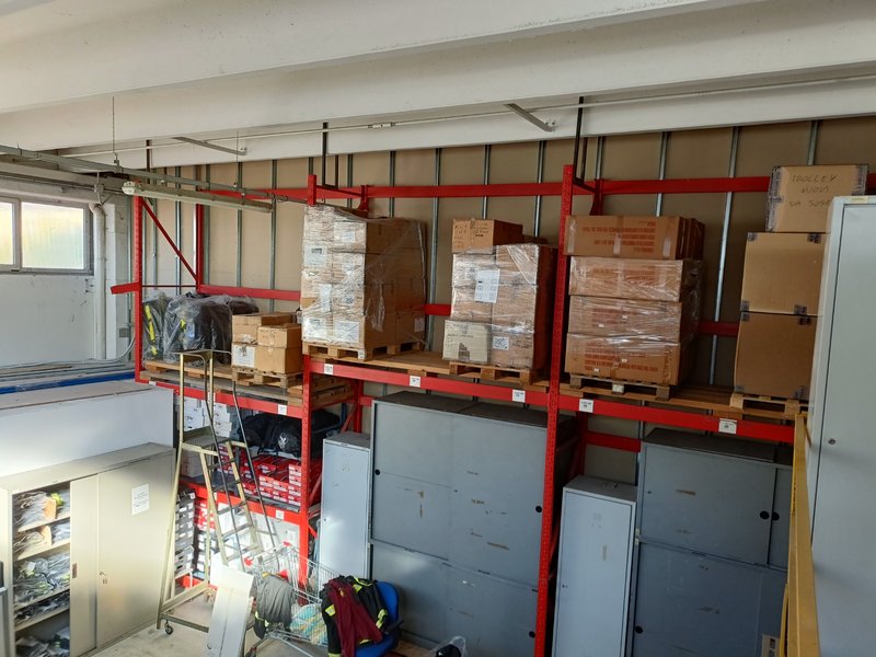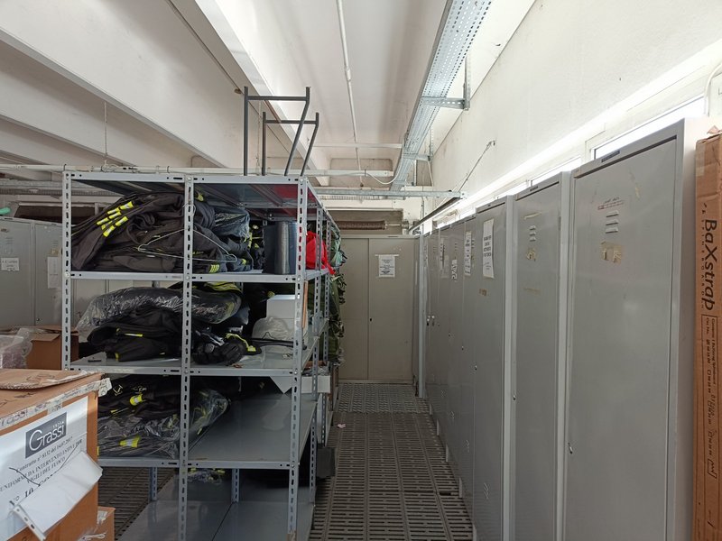 All'interno dello stabile che ospita sia gli automezzi della colonna mobile, dove anche qua ci sono portoni sezionali da sistemare e rattoppati dal personale, c'è anche il magazzino centrale. Magazzino all'interno del quale ci sono i DPI destinati al personale in servizio, attrezzature di caricamento degli automezzi e deposito di detergenti e oli. I DPI sono all'interno di scaffali e armadi che non sono chiusi ermeticamente, favorendo l'ingresso di insetti e di topi. Il magazzino è privo di un'adeguata ventilazione e d'estate, per il personale che vi opera all'interno, diventa molto problematico eseguire i propri compiti perchè le temperature raggiungono i 45 gradi, contravvenendo alle più semplici regole del D.lgs. 81/08, mettendo in serio pericolo la salute del personale. (immagini 26-27-28-29-30)