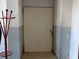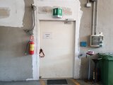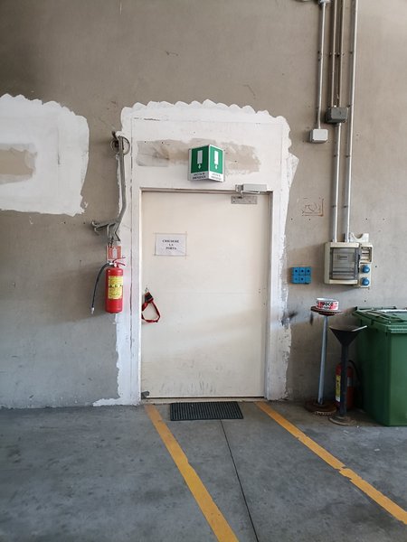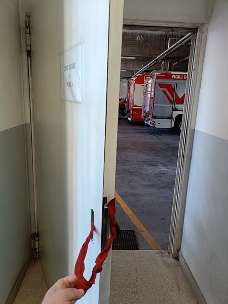 Da oltre due anni, la porta tagliafuoco che separa l’autorimessa dall’atrio principale non si chiude correttamente e viene tenuta aperta con una cinghia in tela rossa.